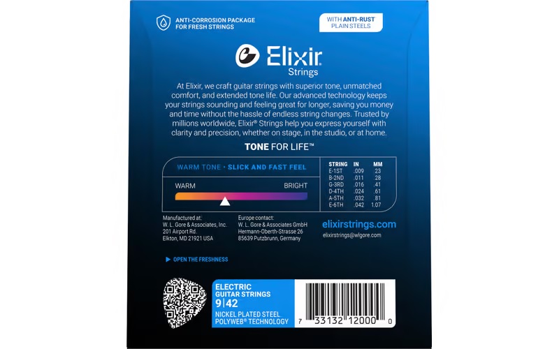 Elixir® Electric Nickel Plated Steel Strings with POLYWEB Coating deliver their own distinct warm tone together with extended tone life.